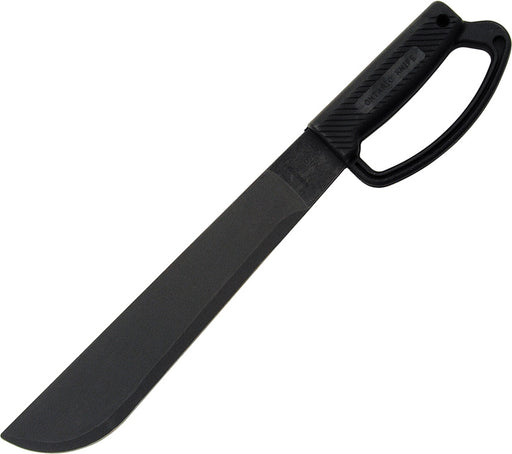 17 7/8" overall. 12 1/4" black zinc phosphate finish 1095 carbon steel blade. One piece molded black plastic handle with knuckle guard.