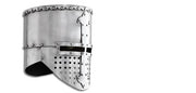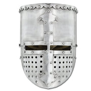 Dating from a 12th - 13th century style, this flat-top Great Helm provided full face protection before the advent of the visor. This helm provides excellent head protection for the re-enactor, with greater comfort and safety provided by oversize ventilation holes and a reinforced nasal. Crafted in 14 gauge steel, lined and ready for use.