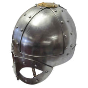 This version of the Viking "Spectacle Helm" features crossed reinforcing straps over welded 16 gauge construction. The eyeguard features an integral ridged nasal and rivet decoration. A full leather suspension and chinstrap are fitted.