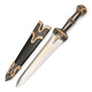 | Gladiator Dagger -Styled after a Roman Pugio -Detailed scabbard accents and handle -Blue faux gem set into pommel -Blade has gold inscripted characters in battle |