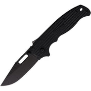 4.38" (11.13cm) closed. 3.25" (8.26cm) black DLC coated D2 tool steel clip point blade. Black checkered handle. Thumb stud. Thumb pull. Lanyard hole. Pocket clip.