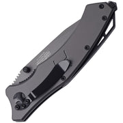 Linerlock. Assisted opening. 5" closed. 3.5" gray titanium coated partially serrated 8Cr13MoV stainless tanto blade. Gray titanium finish stainless handle. Extended tang. Glass breaker. Lanyard hole. Thumb stud. Pocket clip.
