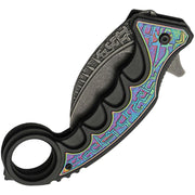 Assisted opening. 5.75" (14.61cm) closed. 3.25" (8.26cm) black stonewash finish 3Cr13 stainless karambit blade. Black ABS handle with Spectrum stainless onlay. Extended tang. Finger ring. Pocket clip. Glass breaker.