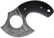 4.25" overall. 2.75" Damascus steel blade. Horn handle. Full tang. Lanyard hole. Finger ring. Brown leather belt sheath included.