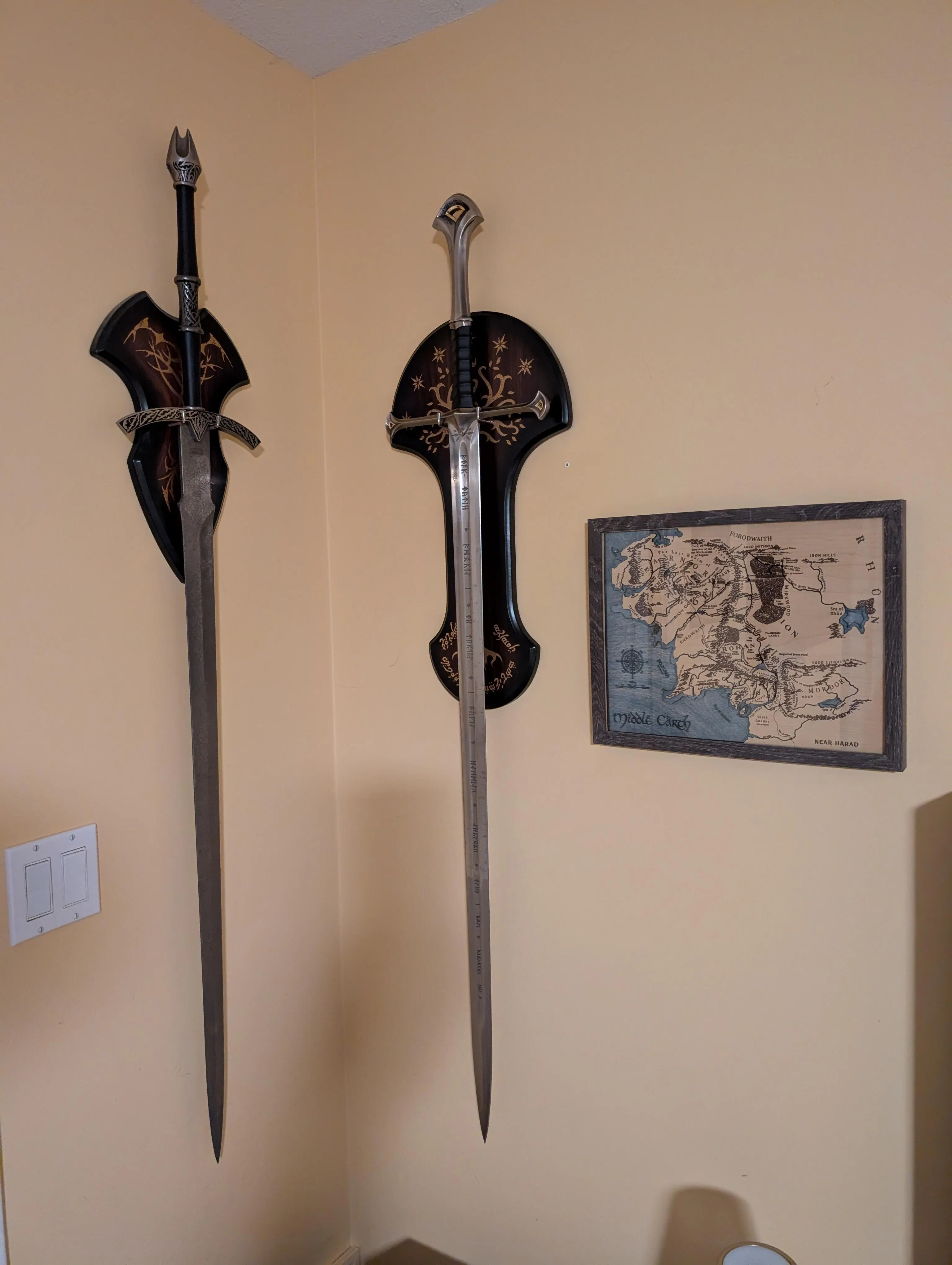 With over 100 million copies sold in over 40 languages, millions have grown up with The Lord of the Rings, the classic epic tale considered by millions to be the greatest fantasy-adventure story ever told. J.R.R. Tolkien's phenomenal epic trilogy chronicles the struggle between good and evil for possession of a magical ring. The book trilogy, named the most popular book of the 20th Century, has been presented in a series of feature films from New Line Cinema. Solid metal cross guard and pommel, antique silver plated finish. 24-K gold plated fittings. Genuine leather-wrapped grip. 420 stainless steel blade. Authentic runes deep-etched on both sides of the false-edged blade. Wooden display plaque. Certificate of authenticity. 52 7/8" overall. 40 5/8" blade.