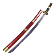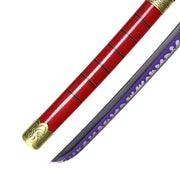 | -High carbon steel blade with decorative flame “hamon” motif -Wood scabbard, partially cord-wrapped |